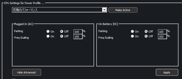 1. “CPU Setting for Power Profile”と書かれた下のバーを「究極のパフォーマンス」に変更し、[Make Active]ボタンをクリックします