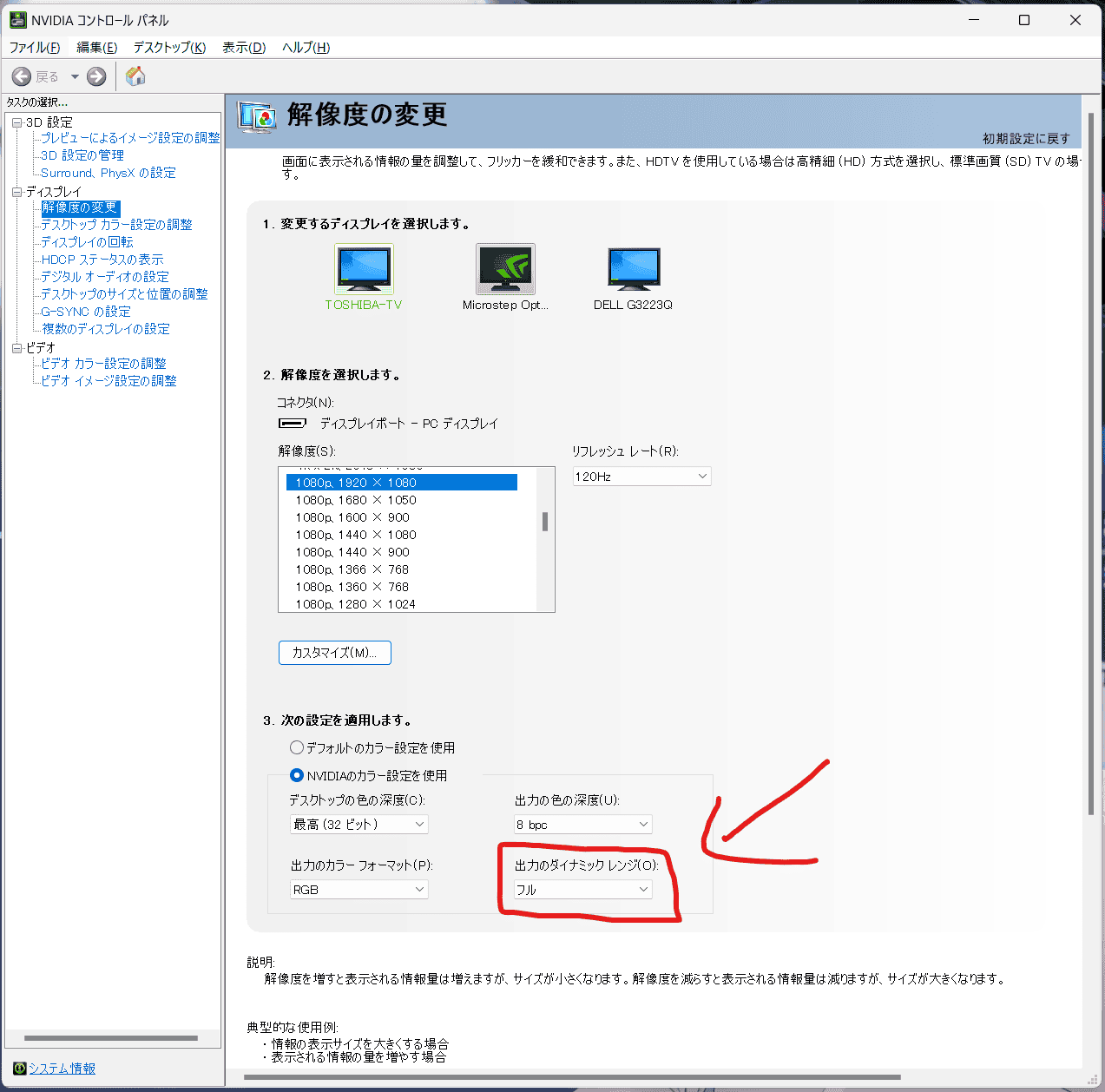 3. (120Hz対応モニターの場合) リフレッシュレートを120Hzにします