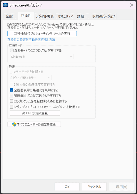 3. 互換性タブ→「全画面表示の最適化を無効にする」にチェック